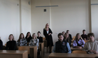 Tiesnese Lauma Paegļkalna Latvijas Universitātes pirmkursniekus iepazīstina ar tiesneša amatu