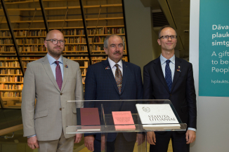 Baltijas valstu Augstāko tiesu priekšsēdētāji dāvina grāmatas Tautas grāmatu plauktam