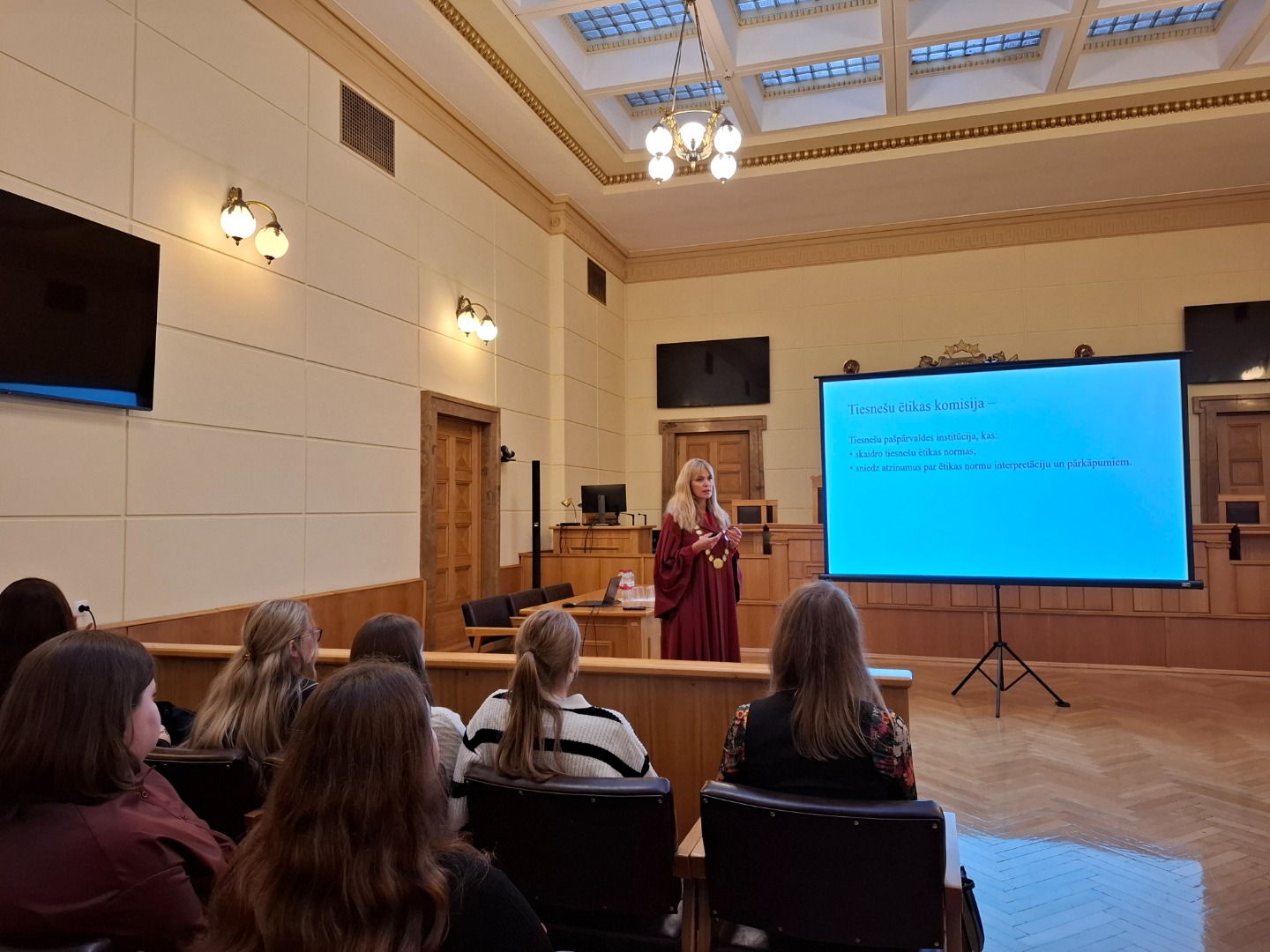 The Chair of the Judicial Ethics Commission, Senator Diāna Makarova, introduced the students to the work of the Commission, its composition, and the Code of Judicial Ethics. She spoke about cases related to judicial communication with journalists and on social media platforms, and provided examples of issues examined by the Commission. In its opinions, the Judicial Ethics Commission has emphasized that when interacting with media representatives, judges must ensure that their responses or refusals to give comments are well-considered, comply with high ethical standards, and do not undermine public confidence in the judiciary. Regarding judges' activity on social networks, the Commission has pointed out that this way of communication imposes additional obligations – the position of judge and the corresponding ethical principles do not allow them to use social networks in the same way as other users do. Although judges have the right to express their opinions on issues of public importance, they must at the same time ensure that their way of communication is neutral, responsible, and consistent with their status.