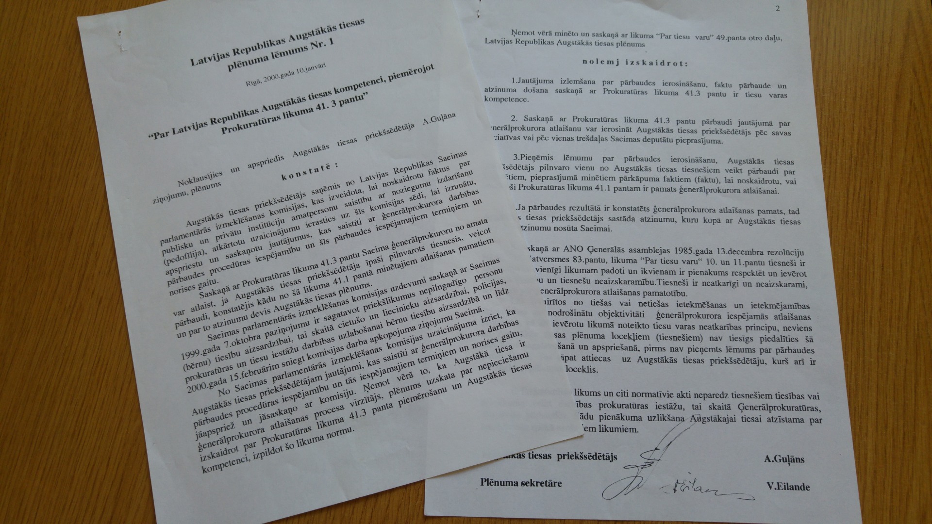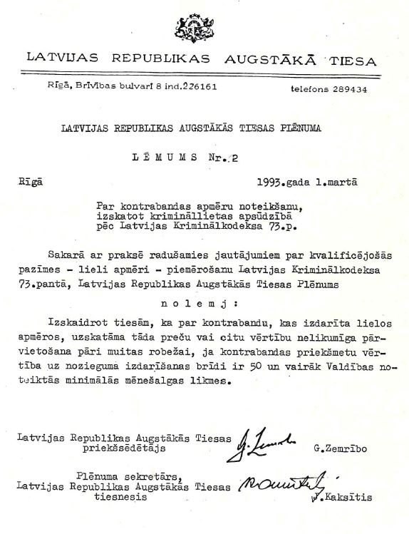 Additional information: Until December 2, 2002, Section 49, Paragraph two of the Law “On Judicial Power” provided that “the Plenary Session shall adopt explanations binding on courts regarding the application of laws”. It was acknowledged that the decisions of the Plenary Session of the Supreme Court are a universally binding source of law. The Constitutional Court in case No 2002-06-01 “On the Compliance of Section 49, Paragraph two of the Law“ On Judicial Power ”with Articles 1 and 83 of the Satversme (Constitution)” acknowledged that the provision that authorized the Plenary Session of the Supreme Court to issue decisions binding on courts was in conflict with the principle of separation of powers, it restricted the independence of judges (courts), and court rulings adopted by applying the binding explanations of the Plenary Session of the Supreme Court may came into conflict with the principle of justice contained in Article 1 of the Satversme.