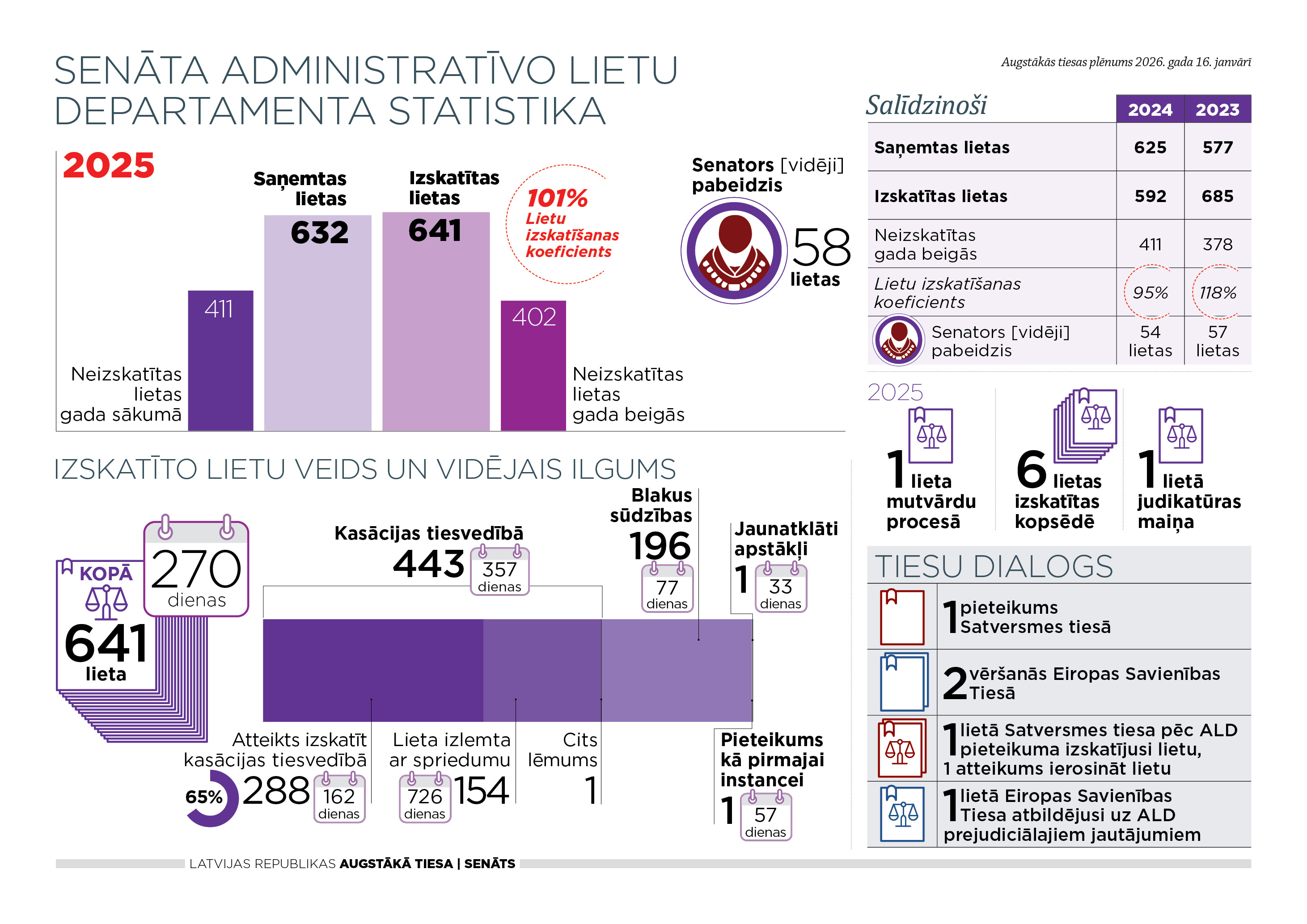 Neskatoties uz saņemto lietu pieaugumu, departaments gadu ir noslēdzis ar pozitīvu lietu izskatīšanas koeficientu (101%). Izskatīta 641 lieta, kas pārsniedz saņemto lietu skaitu. 2025. gadā ir nedaudz samazinājies lietu uzkrājums.