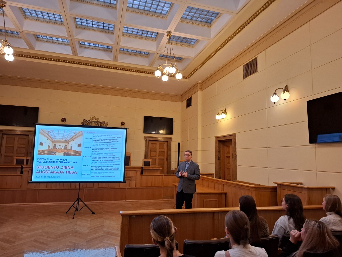 Augstākās tiesas padomnieks Senāta komunikācijas jautājumos Viesturs Lācis studentiem pastāstīja par savu ikdienas darbu, kas saistīts ar informācijas apkopošanu un sagatavošanu par Senātā izskatāmajām lietām. Viņš skaidroja, pēc kādiem kritērijiem tiek izvēlētas lietas preses relīzēm un kā norit ikdienas sadarbība ar medijiem un žurnālistiem.