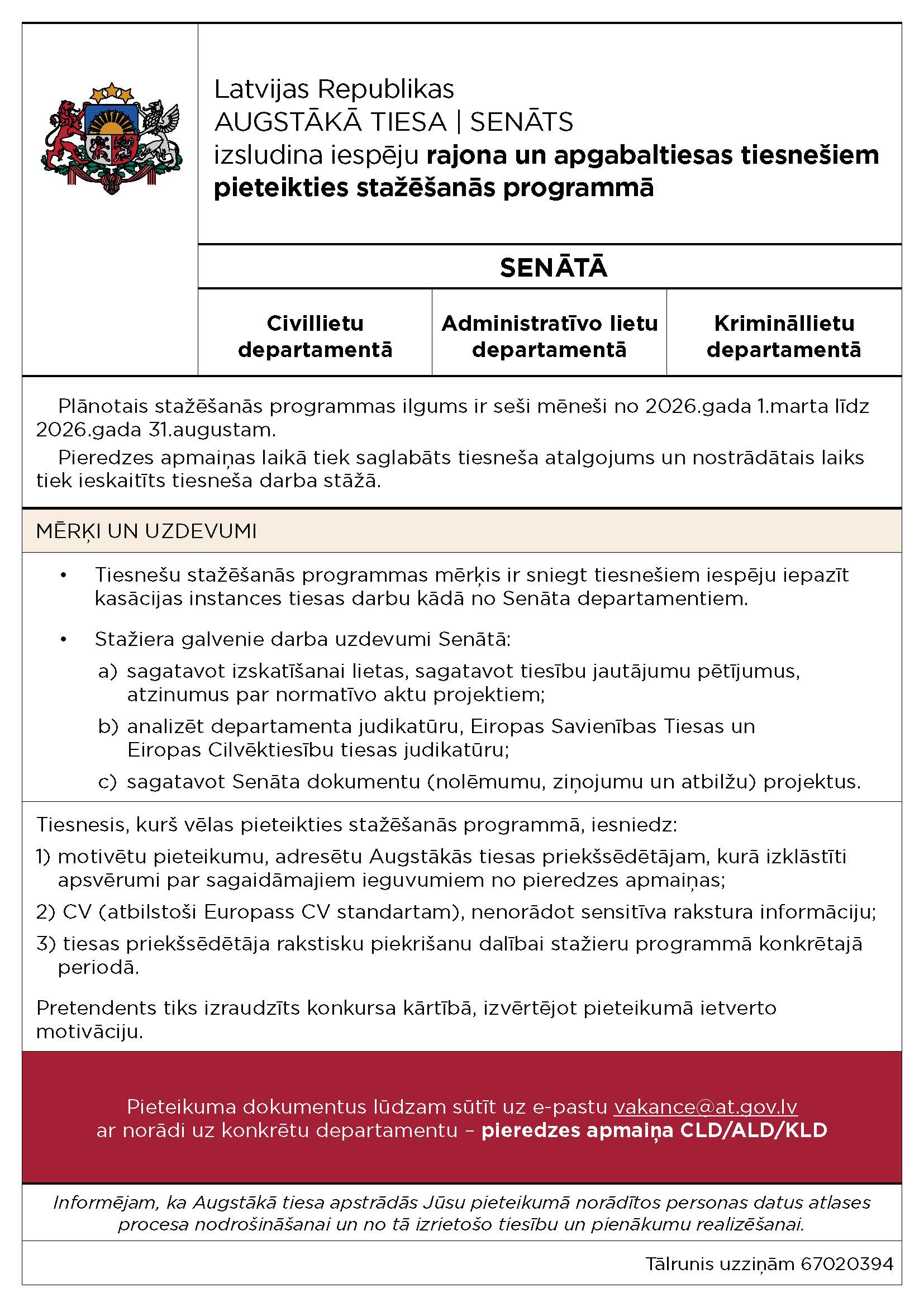 Stažēšanās programmas ilgums ir seši mēneši. Pieteikties programmai tiesneši var konkursa kārtībā.