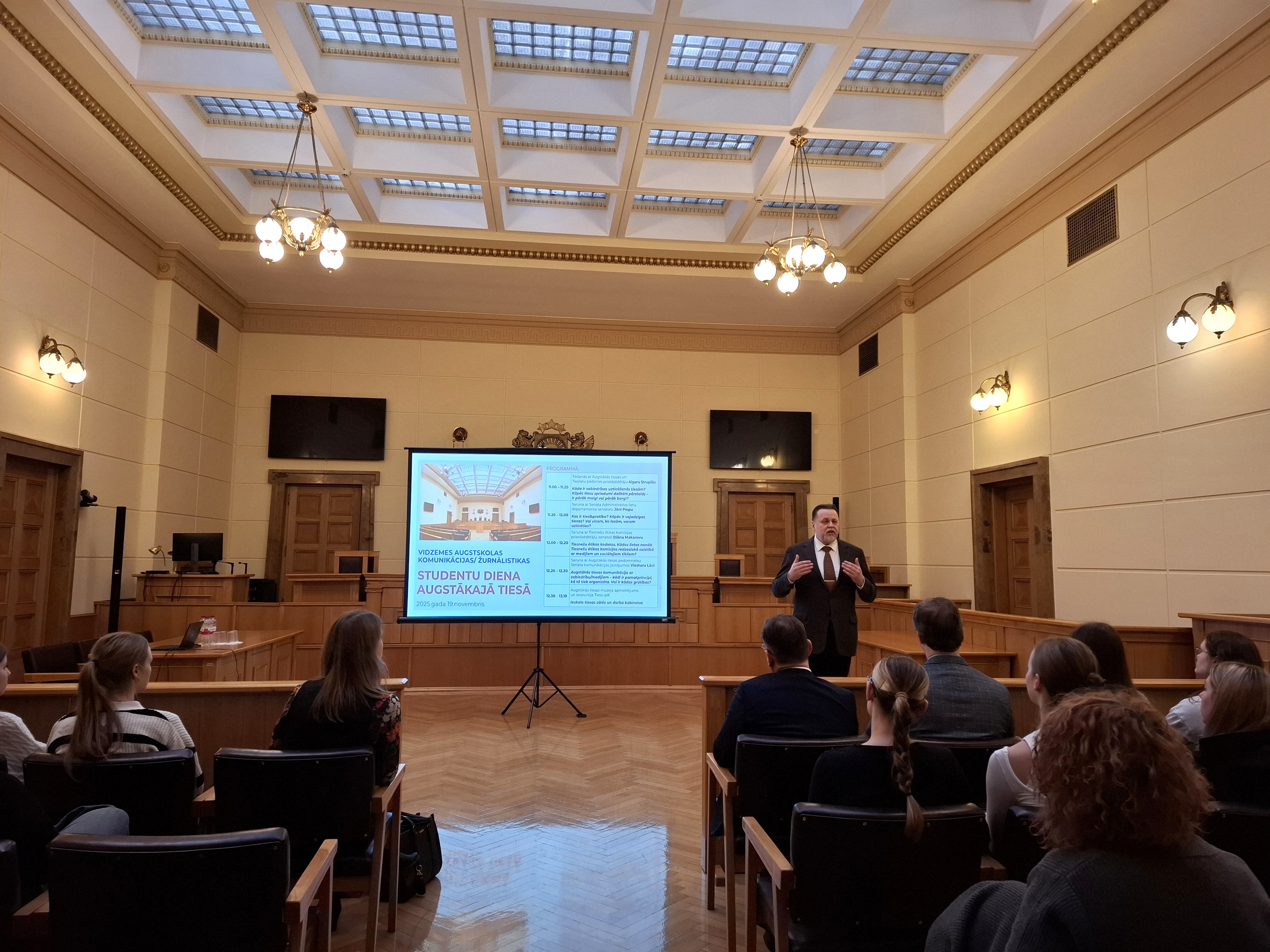Viesturs Lācis, Adviser in the Matters of Senate Communication, told the students about his daily work, which involves gathering and preparing information on cases being examined by the Senate. He explained the criteria used to select cases for preparation of press releases and how daily cooperation with the media and journalists takes place.